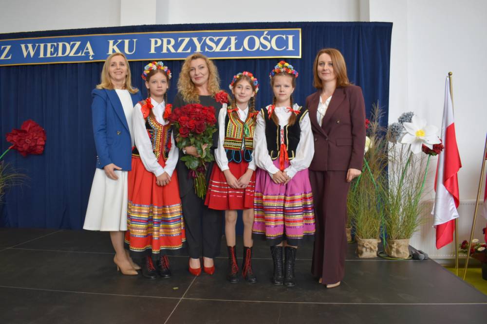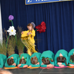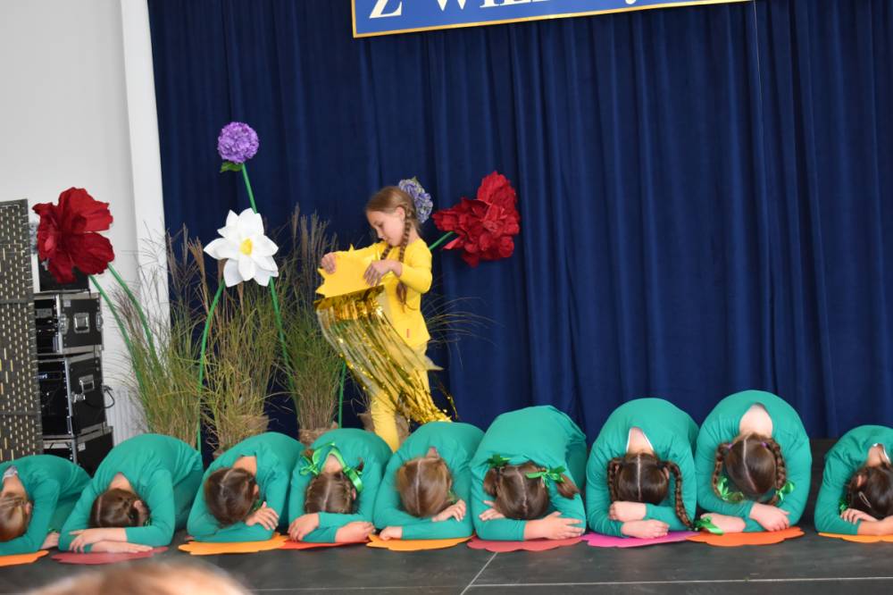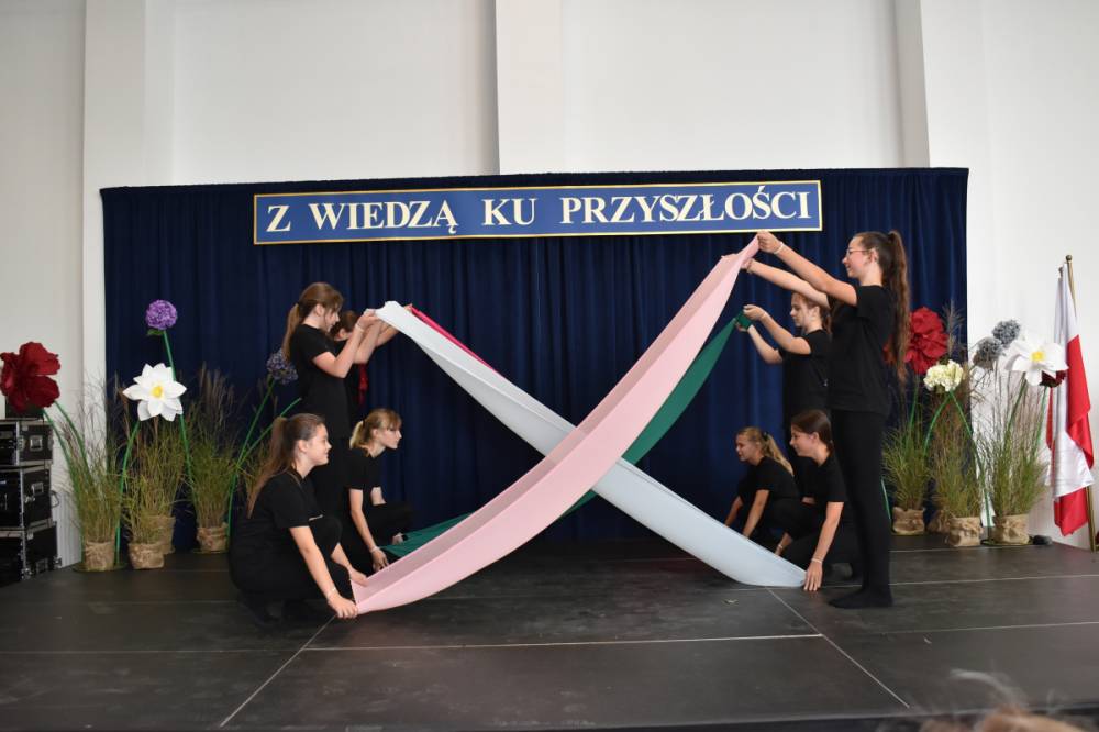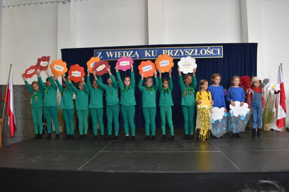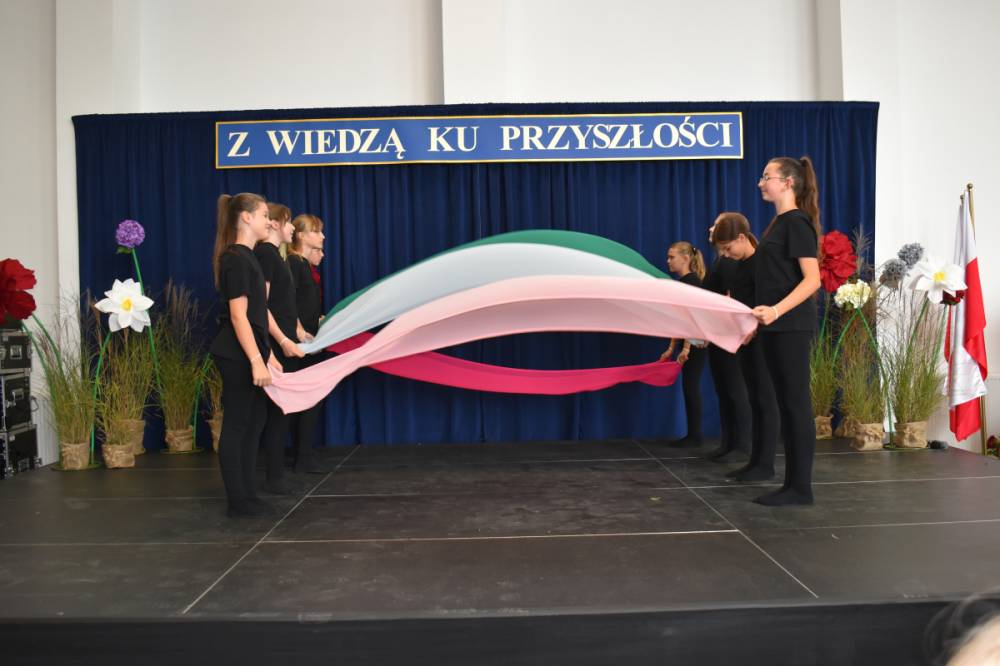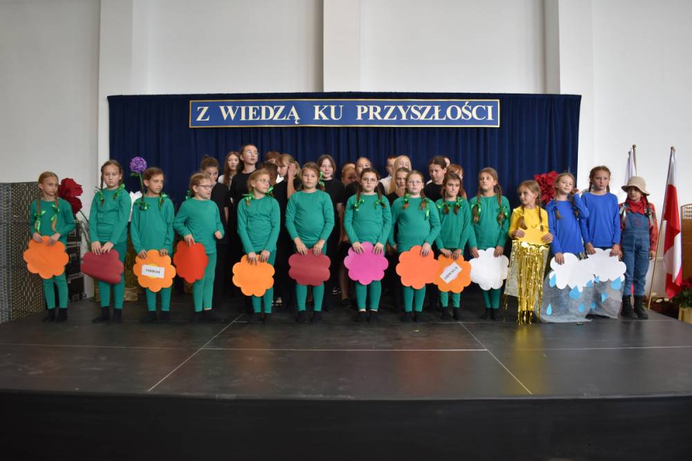 Uczennice klasy III a i III b, w składzie Dorota Zrol, Maja Palichleb, Martyna Bil, Kaya Kołodziejczyk, Hanna Białoszewicz, Maria Brudnowska, Julia Krosman, Maja Tujak, Magda Kościuk, Kornelia Załoga, Natalia Kukiełka, Marika Winnik, Aleksandra Kawa, Emilia Bełz :przedstawiły inscenizację, która poprzez symbolikę rosnących kwiatów pokazała jakie piękne wartości wyrosną w nas, kiedy będą odpowiednio pielęgnowane. Część artystyczna mówiła nam, że szkoła, choć nowa, to tak naprawdę ma swoją historię, tradycję i wyjątkowy klimat, który można poczuć już pierwszego dnia. To, nie tylko miejsce nauki, ale też przestrzeń inspiracji, współpracy i radości dzieciństwa. Patronem jest pisarz Henryk Sienkiewicz, który w swoich utworach pokazuje jakie wartości są w życiu ważne, jakich wyborów należy dokonywać, by żyć mądrze i właściwie. Celem widowiska było ukazanie, że szkoła to wyjątkowe miejsce w życiu każdego człowieka. To ona otwiera tysiące możliwości i pomaga wybrać tę jedyną słuszną drogę.